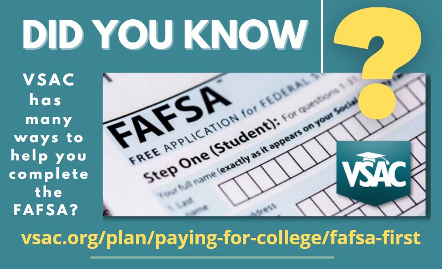 - There are also FAFSA Forms Workshops at high schools throughout the state. Check the VSAC Calendar of Events for more details.